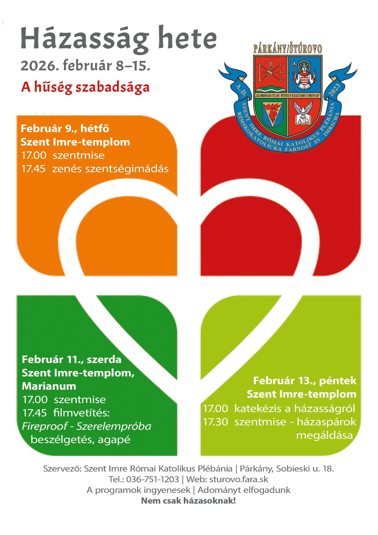Házasság hetePlébániánk és a házasközösség tagjai a ma kezdődő Házasság hete alkalmából több plébániai programra is hívják az érdeklődőket. Hétfőn a szentmise után zenés szentségimádás lesz. A szerdai szentmisét 17.45-től filmvetítés követi a Marianumban. A film címe: Fireproof - Szerelempróba. A vetítés beszélgetéssel és agapéval zárul. Csütörtökön a szlovák nyelvű, pénteken pedig a magyar nyelvű szentmisét házasságról szóló katekézis előzi meg 17.00 órakor. Majd az utána következő szentmisében a szentségi házasságban élők megáldása lesz (külön minden házaspárt). Köszönöm a házasközösség igyekezetét!